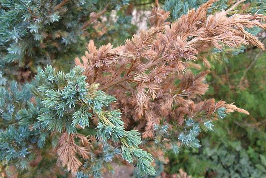 Владелец можжевельника должен быть готов к тому, что при его выращивании можно столкнуться с различными проблемами, связанными с ростом и развитием кустарника. К примеру, заливы почвы, произошедшие в результате неправильного полива либо паводка, подъёма уровня грунтовых вод, могут приводить пожелтению, усыханию и опаданию иголок. Резкие перепады температур, весенние заморозки, первые палящие лучи солнца повреждают кору, хвою, корни.