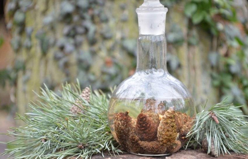 Потребуются шишки, хвоя, самогон (70%) в пропорции 1:1:1. Соединить все составляющие в стеклянной посуде, настаивать 10 дней, а после процедить.