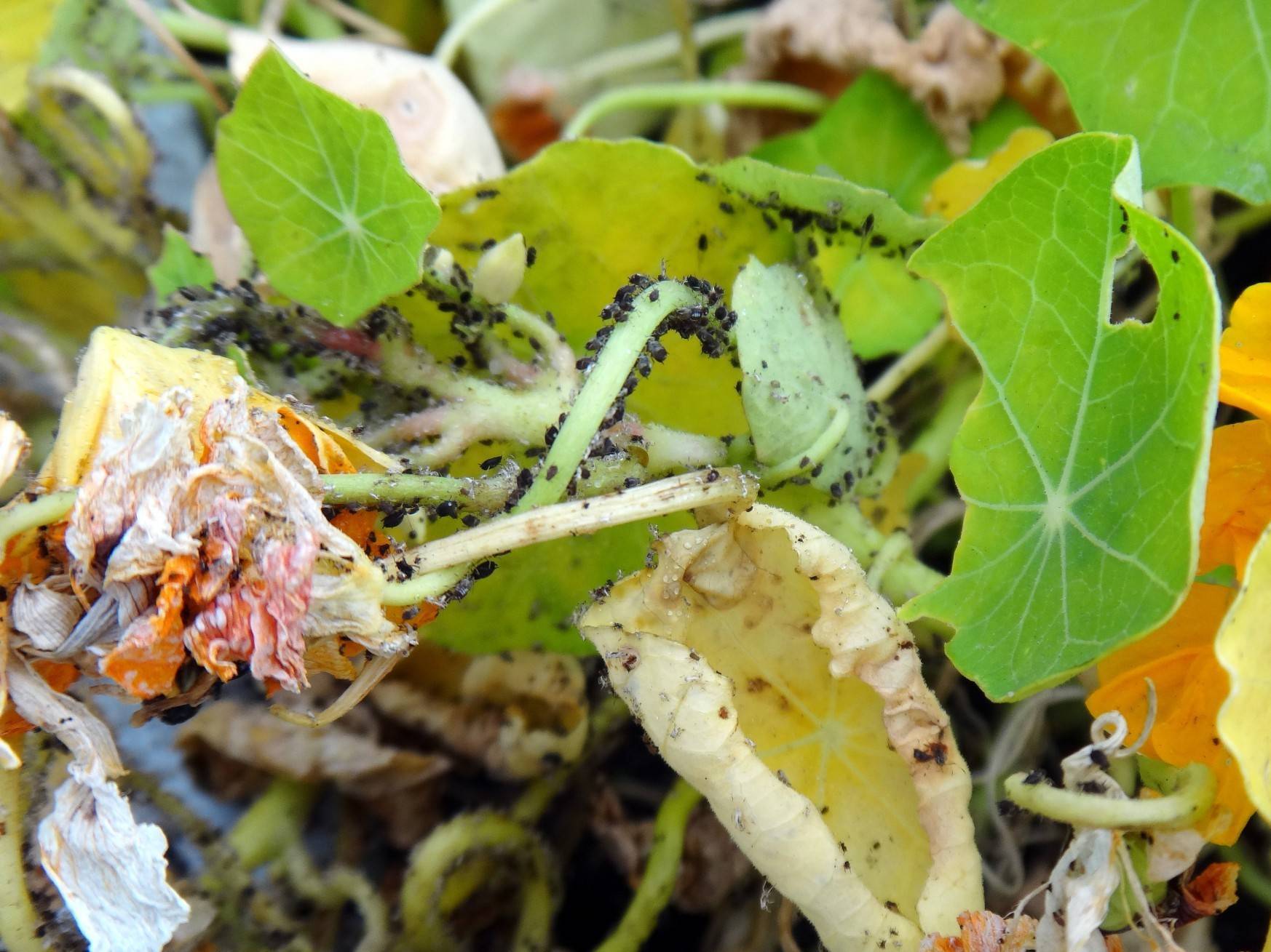 Запах настурции отпугивает многих вредителей, поэтому ее часто выращивают на овощных грядках. Но все же, некоторые насекомые не прочь полакомиться ее листьями и стеблями.