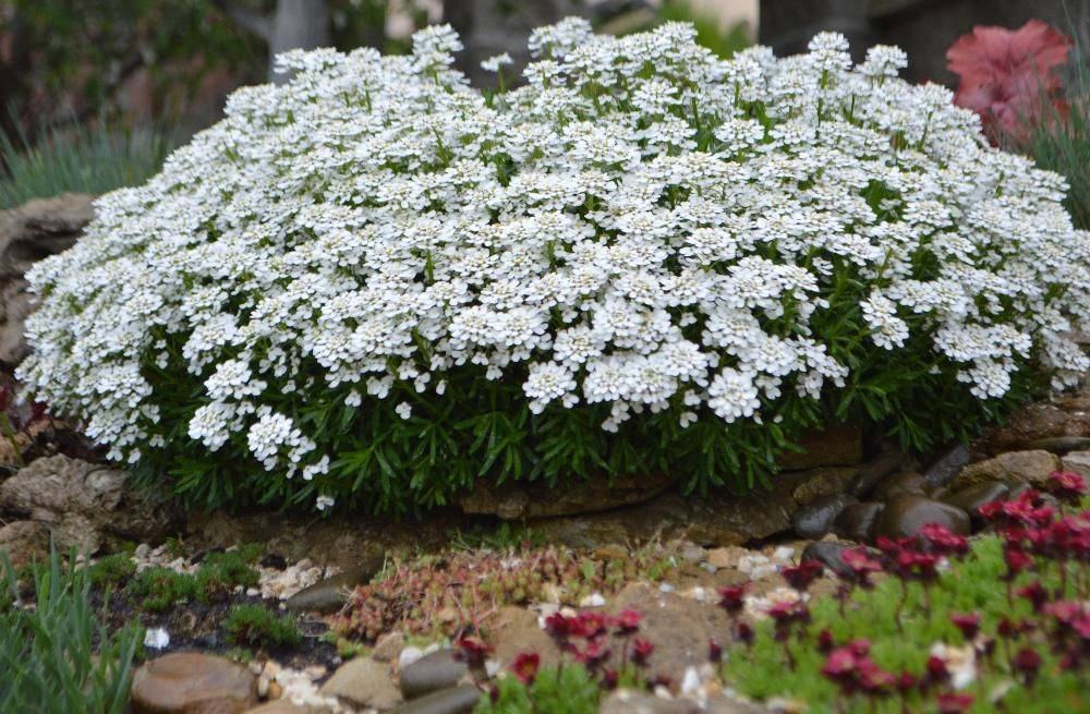 Цветет непрерывно на протяжении двух месяцев, начиная с мая. Замечательно смотрится иберис в комбинации с другими цветами, легко переносит любое соседство. Очень эффектно сочетание белого нежного ибериса и яркой красной гвоздики, других ярких цветов.