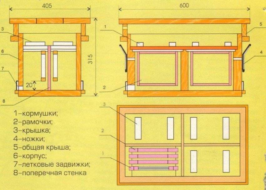 Конструкция этих мини-ульев довольно проста и схожа с обычными, единственное отличие – это размеры. Каркас можно делать из любого дерева, главное, чтобы все стенки были двойными и утепленными. Дно и крышку также следует утеплить. Утеплять можно пенопластом. Достаточно сделать один леток для пчел, чтобы система вентиляции функционировала на должном уровне.