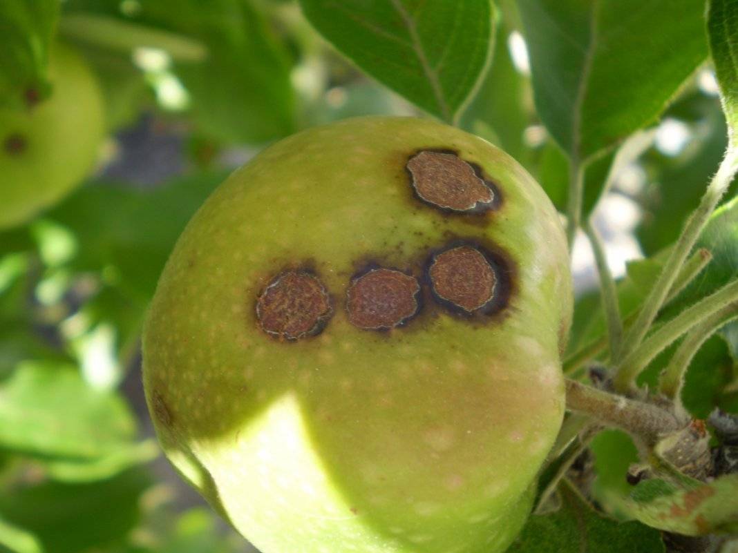 Сильно пораженные листья засыхают и облетают, заражая при этом плодоножки, завязи и уже успевшие вырасти плоды. Яблоки покрываются серо-черными круглыми точками, также имеющими вначале бархатистый налет. Постепенно эти пятна увеличиваются в размере, а на их поверхности образуются покрытые трещинами наросты. В результате яблоки деформируются, замедляются в росте и становятся мелкими.
