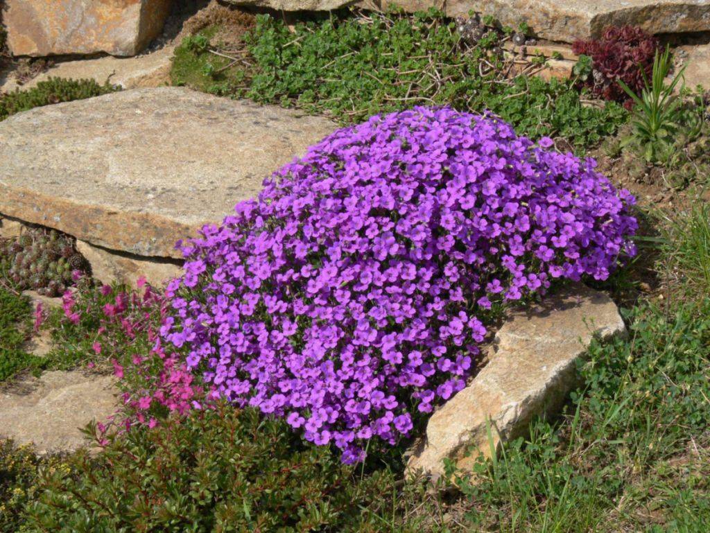 Аубреция – это неприхотливое почвопокровное растение, образующее живой коврик, растет быстро, поэтому его так любят садоводы. Высотой до 20 см с мелкими опущенными эллиптическими листьями с зубчатыми краями. Цветет до самой зимы.