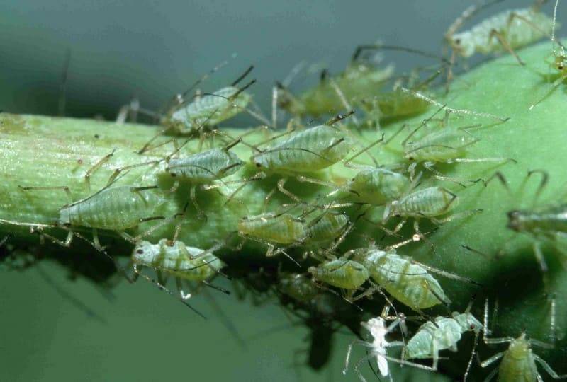 Симптомы: тля заметна визуально – это крошечные зеленые жучки. Сами по себе они практически не опасны, но они питаются соками растения, ослабляя его и делая более восприимчивым к другой заразе. Если у вас появилась тля, то листья растения будут сохнуть, желтеть, будут заметны коричневатые точки – это места, где полакомилось насекомое.
