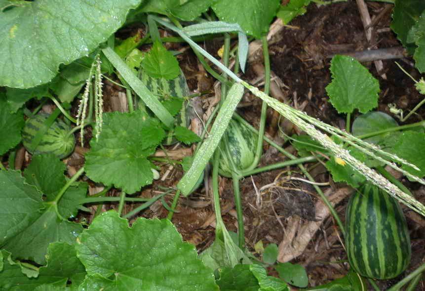 Высаживала я свои кустики в помидорной теплице, у стенок. В противоположном углу четырехметровой теплицы также рос отгороженный арбузик.