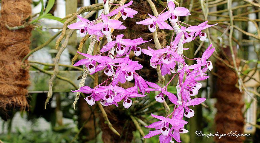 Дендробиум Париша родом с азиатских плоскогорий. Этот вид отличается тем, что периодически сбрасывает листья. Цветы крупные – до 8 см в диаметре, окрас может быть фиолетовый, розовый, но интенсивность его усиливается по краям цветков.