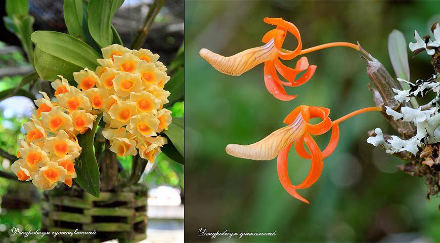 Дендробиум уникальный (Dendrobium unicum) – миниатюрное растение с ярко-выраженной периодичностью в развитии. Цветки ярко-оранжевые с более светлой губой. Довольно сложное для выращивания.