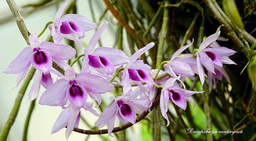 Дендробиум непахучий (Dendrobium anosmum) – эпифит, широко распространенный в Юго-Восточной Азии. Популярный гибрид от d. anosmum – Superbum с более крупными (до 8 см) и гораздо более яркими ароматными цветками. Может цвести в любое время года, пик цветения приходится на конец зимы. Интересно, что орхидеисты поразному оценивают его запах: кому-то он кажется банановым, кто-то угадывает в нем аромат малины, а кто-то и ревеня. С другой стороны, известно, что орхидеи действительно могут пахнуть по-разному и даже менять свой аромат в период цветения.