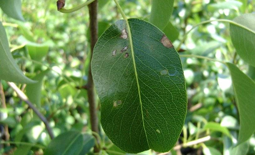 Грушевая парша по симптомам схожа с филлостиктозом (бурая пятнистость). Эта инфекция тоже вызывается грибком, но различие в том, что на таких же, как и при парше, бурых пятнах есть мелкие точки черного цвета.