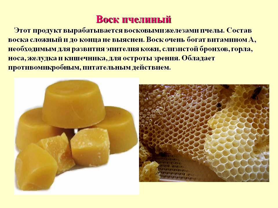 Воск — это биологически активное вещество, имеющее высокие бактерицидные свойства. Его издавна используют в медицине, особенно в сочетании с медом. Он служит основой для многих фармацевтических и косметических препаратов. Его используют для изготовления лечебных кремов, мазей, пластырей; он входит в состав лечебных свечей.