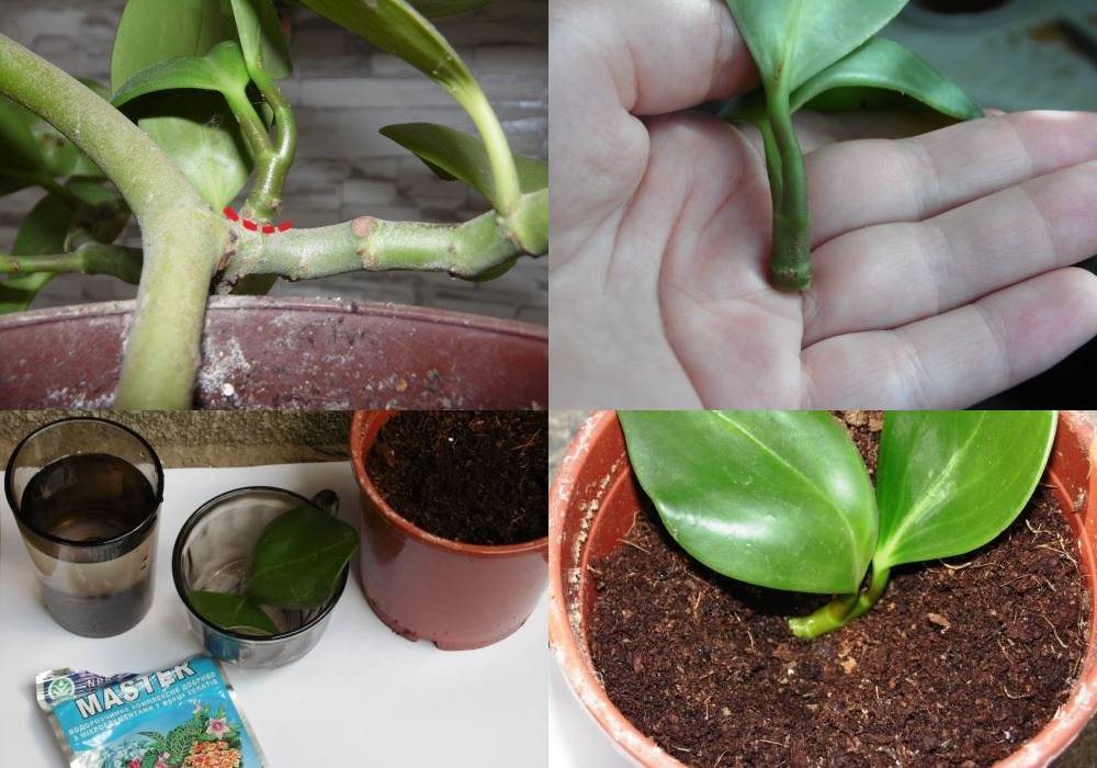 Размножение пеперомии черенками проходит четырые стадии: обрезка черенка, обработка среза обеззараживающим средством, укоренение в воде, посадка в горшок