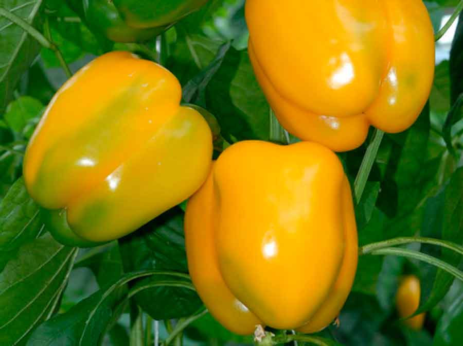 Невысокие компактные кусты этого сорта украшают яркие желто-оранжевые сладкие перцы. Картина восхитительная, при этом плоды вкусные и очень сочные. Это и является объяснением популярности сорта во многих областях России.