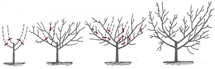 - В последующий год, на ветвях второго яруса оставляют несколько ветвей 3 порядка и срезают их на 1/3. Приросты на них прореживают, из оставшихся — часть укорачивают, а часть оставляют нетронутыми. На верхних ответвлениях срезают 7–8 почек, на нижних — на 2 почки.