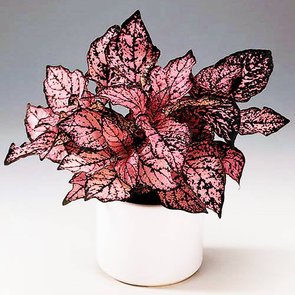 Как видно на фото, цветок с разноцветными листьями Hypoestes sanguinolenta имеет кроваво-красный оттенок, его листва покрыта бледно-розовыми пятнышками, особенно выразительными у разновидности Splash. Для поддержания кустистости прищипывают кончики побегов.