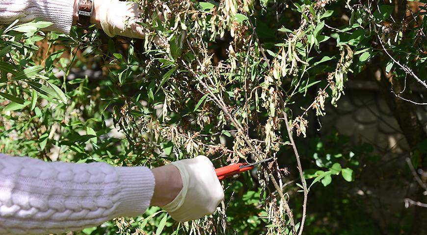 Вовремя проводите формирующую и санитарную обрезки. Загущение кроны ведет к нарушению светового режима, снижению фотосинтеза и, как следствие, вымерзанию однолетних побегов зимой.