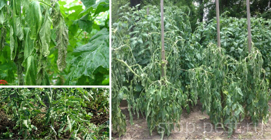 Болезнь вызвана вредоносным грибком. При заражении в теплице листья помидоров скручиваются вниз, желтеют и вянут. На ранних стадиях вертициллезное увядание определяют по хлоротическим пятнам на ботве. Если срезать стебель, то хорошо просматривают бурые сосуды. При сильном поражении болезнь достигает верхушки томатов.