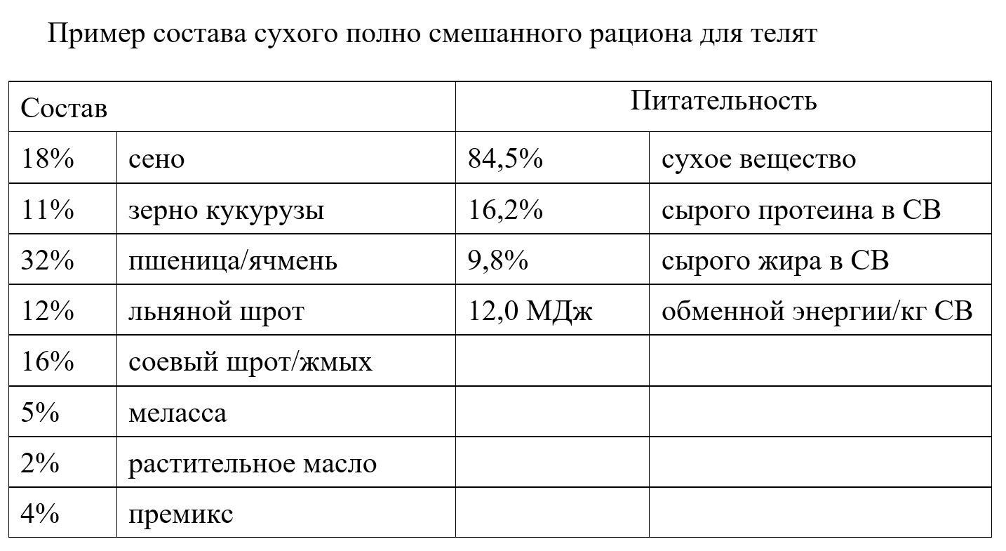 Необходимо обеспечить длину частичек грубых кормов 2–2,5 см. Концентратная кормосмесь состоит из кукурузы цельнозерновой, сухого жома свекловичного, плющенных злаковых зерен, жмыхов, шротов, зернобобовых. Рецептура предусматривает использование растительного масла, мелассы, а также премикса для телят. Приучают к полносмешанному рациону с четвертого дня жизни. Скармливают кормосмесь в зависимости от поедаемости. При потреблении 1,5 кг кормосмеси начинают убирать молочные корма и приучать к силосу.
