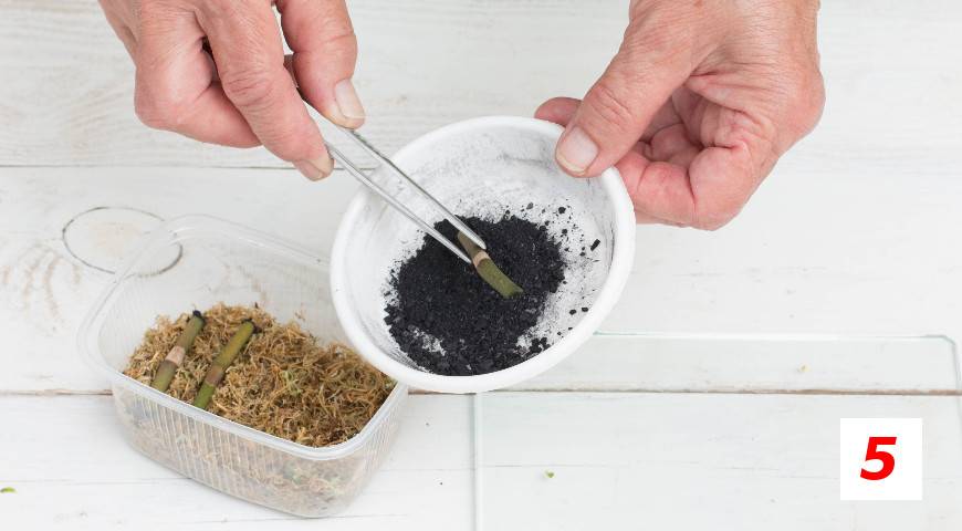 Места срезов следует припудривать размельченным активированным углём (для дезинфекции) и оставлять на некоторое время для подсыхания.