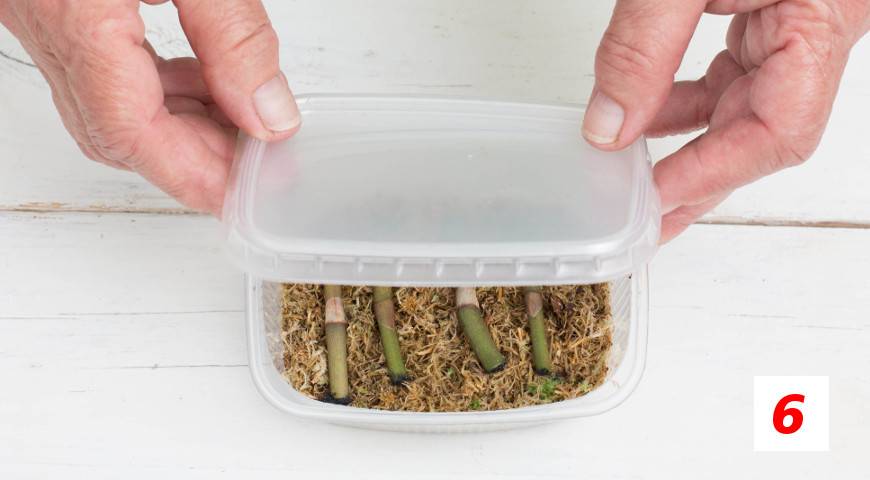 Наполните контейнер влажным сфагнумом. Уложите плашмя черенки, накройте их и поставьте в теплое место. Оптимальная температура +26…+28 °С.