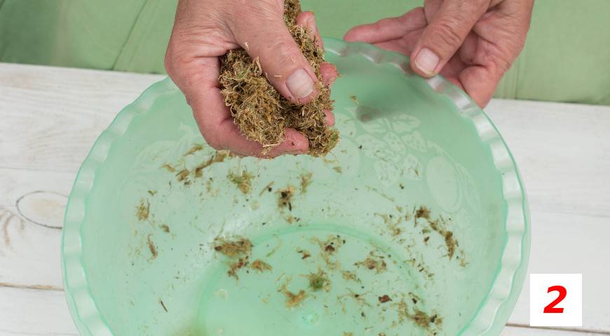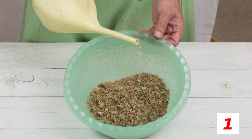 Измельчите и замочите в тазу с чистой водой сухой мох-сфагнум.
