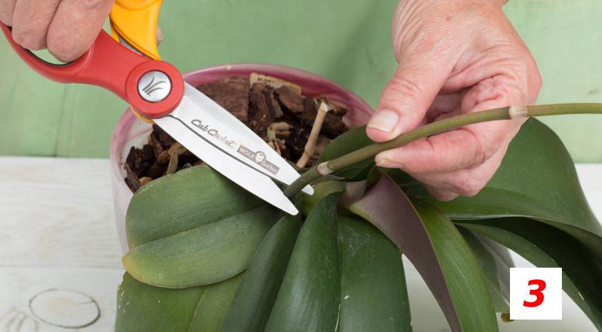Отрежьте цветонос: срез делайте сразу над узлом или у основания.