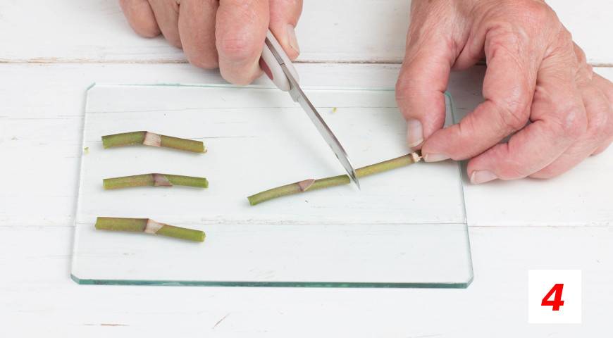 Нарежьте его на фрагменты длиной 5–8 см. У каждого черенка должен быть хотя бы один узел со спящей почкой.
