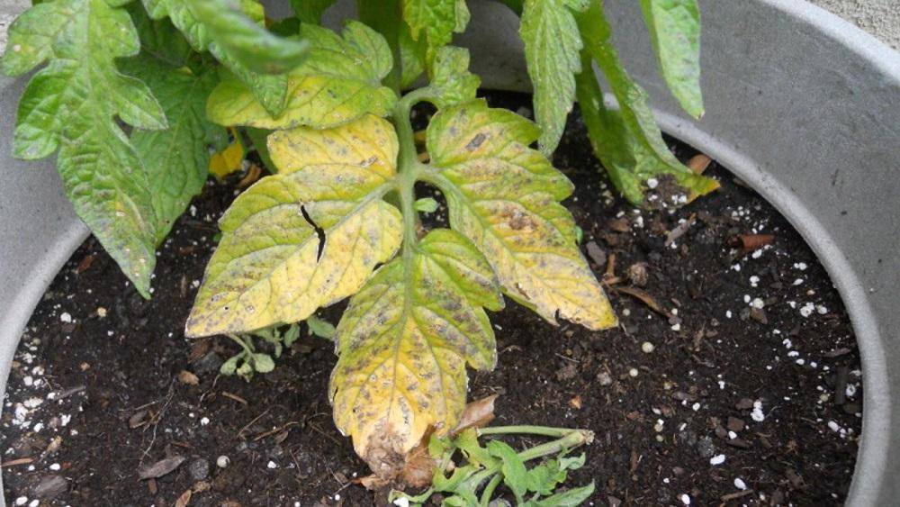 Часто листья желтеют и скручиваются из-за неподходящей влажности почвы. У томатов длинный корень, который забирает воду из глубоких слоев земли. Нет смысла несколько раз в день увлажнять поверхность почвы небольшими порциями жидкости, поливайте нечасто, но обильно, чтобы вода начала вытекать из дренажного отверстия. Не понравится помидорам и жизнь в болоте, не всегда нужно увлажнять грунт, иногда достаточно его порыхлить.