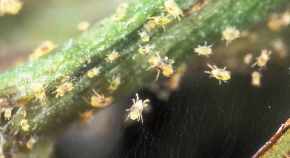 2. Паутинный клещ: цветки опадают, листья бронзовеют. Клещи прокалывают лист, чтобы выпить сок. Проколотое место светлеет, потом лист полностью желтеет. Прожилки сохраняют зеленую окраску. На нижней стороне образуются серовато-мраморные крапинки. Нарушается фотосинтез, ускоряется испарение воды. Когда крапинки сливаются воедино, лист засыхает, опадает. Паутину снимают влажной губкой. При умеренном поражении через каждые 4 дня кусты обрабатывают биопрепаратами (Акарином, Фитовермом). При сильном поражении применяют акарициды: Флоромайт, Санмайт (через 5 дней, 3 процедуры). Повышают влажность воздуха в комнате.