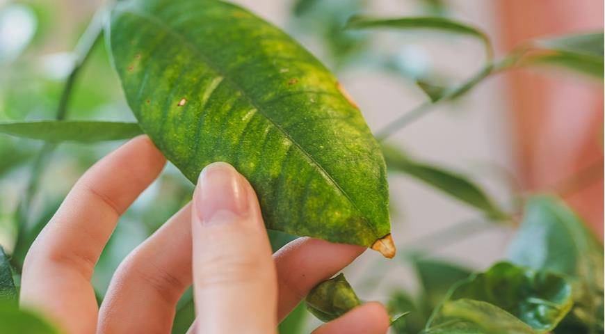 - Если желтизна появляется только на кончике листа, не распространяясь на всю пластину, — дело в недостаточном количестве кальция.