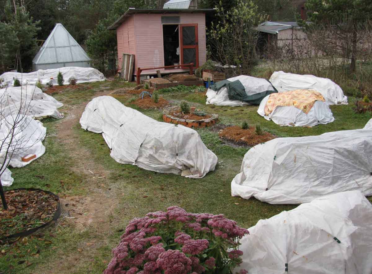 В последнее время популярность приобретает воздушно-сухое укрытие — создание каркаса вокруг цветов из металлических дуг или досок, на который натягивают специальный материал (спанбонд, геотекстиль и др.). Им также просто обворачивают кусты для утепления.
