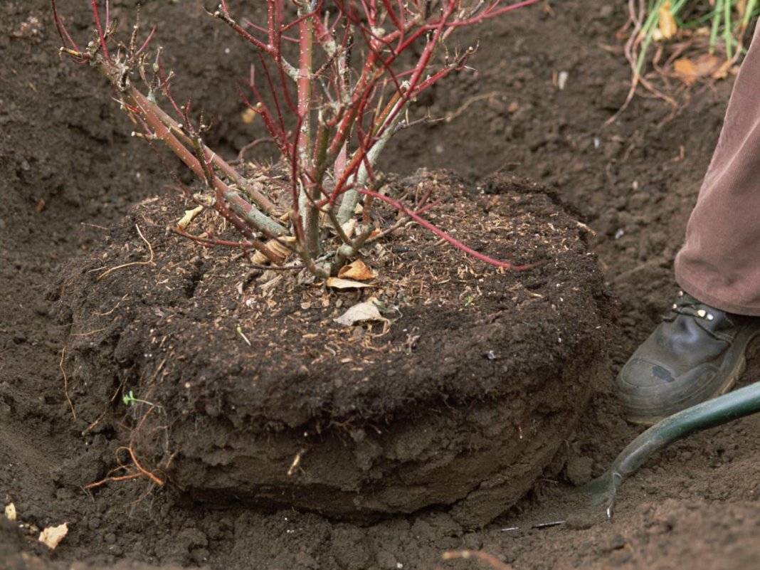 При пересадке взрослого цветка куст выкапывают с земляным комом (чем больше ком, тем лучше). Процесс облегчает предварительный полив. Для удобства побеги связывают веревкой. После выкапывания куст помещают на ткань или другой материал для перемещения к новому месту.