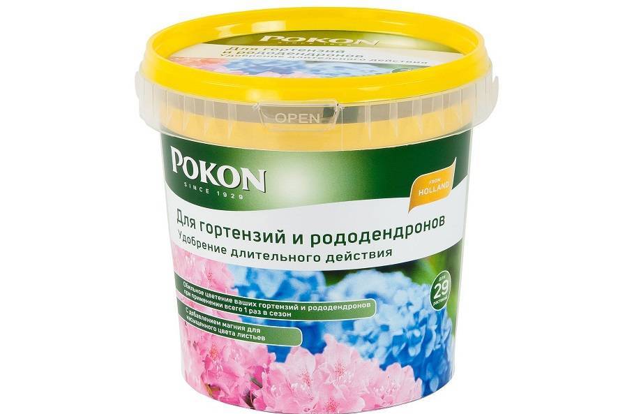 Фирма «Pokon» производит удобрение для гортензий длительного действия в виде сухих гранул.
