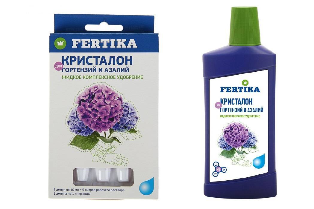 Кристалон для гортензий и азалий − новинка от фирмы «Fertika». Препарат выпускают в жидкой форме, он имеет неограниченный срок годности, в его составе азот, фосфор, калий (2,2:1,8:4,6). Норму препарата определяют колпачком. На литр воды добавляют 10 мл средства (¼ колпачка).