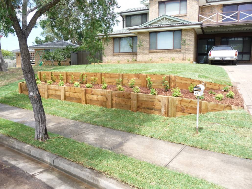 Установка происходит очень плотно, в зависимости от решений дизайна, бревна скрепляются арматурой, хомутами, поперечными перемычками и так далее. После, они засыпаются для устойчивости, а с обратной стороны происходит просыпка слоем материалов для создания водоотвода и уже готовым грунтом для клумбы или формирования другого участка для растений.