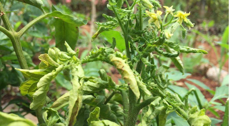 Листья томатов загибаются кверху и начинают желтеть между жилками.