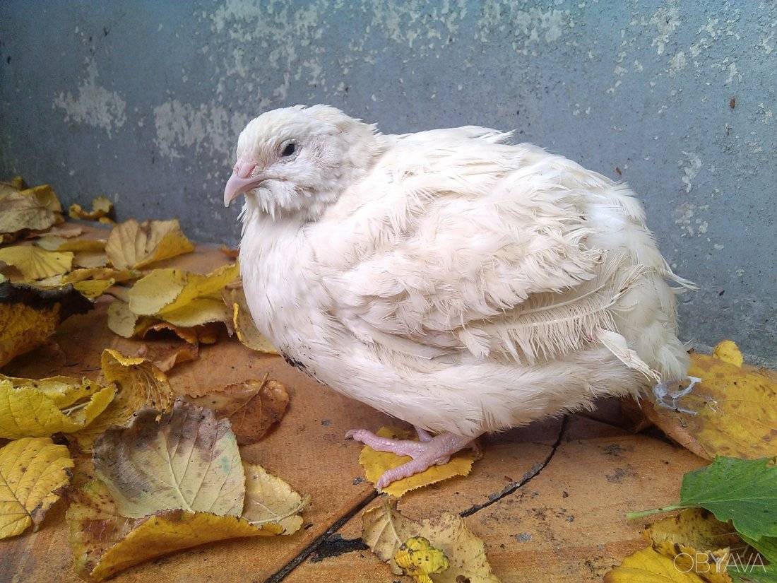 Отличительной характеристикой является не только большой вес и необычный белый окрас, но и цвет кожи. У большинства перепелов оперение темное, поэтому и кожа обладает характерным оттенков.