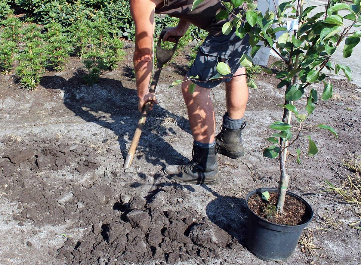 Выбранное место для посадки дерева сначала надо тщательно вскопать. Глубина перекопки не должна превышать длины штыка лопаты. Одновременно в грунт заделывают перегной (можно использовать опилки). Расход составляет не менее 3 кг на 1 кв. м.