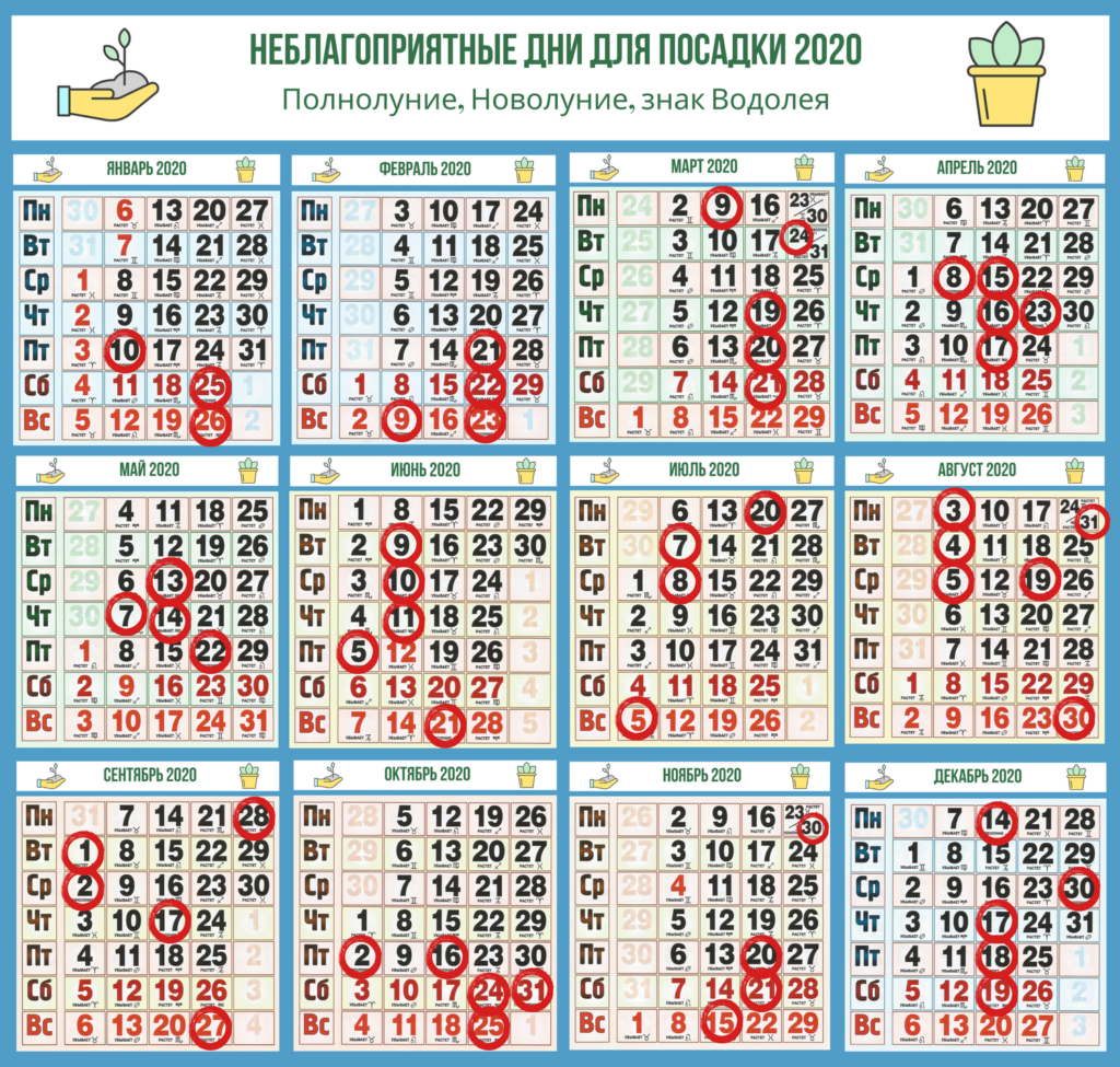 Циклы Луны учитываются на каждом этапе выращивания. Благоприятный период для посадки семян на растущей Луне: семена прорастают быстрее, всходы дружные и крепкие. На основании лунных фаз определены благоприятные дни для посадки: