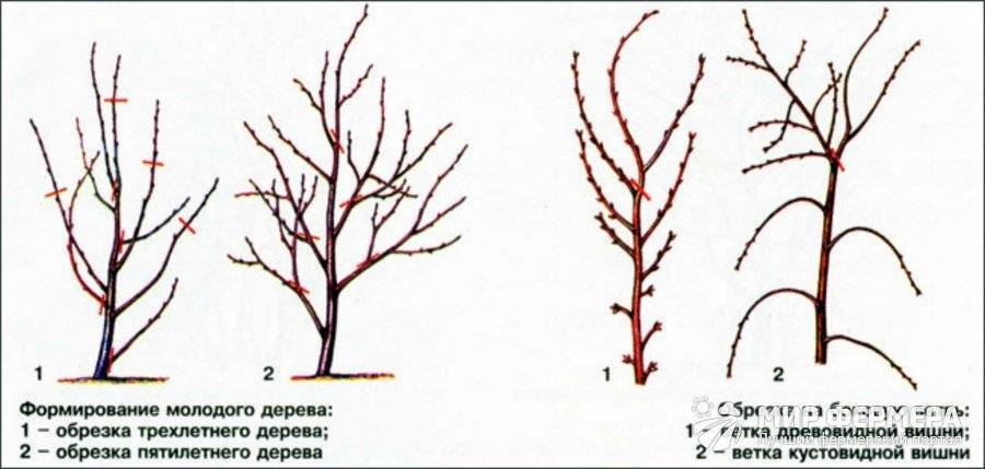 - Обрезка. Каждый год в ранневесенний период в вишнёвом саду делают обрезку: укорачивают длинные ветки и прореживают крону;