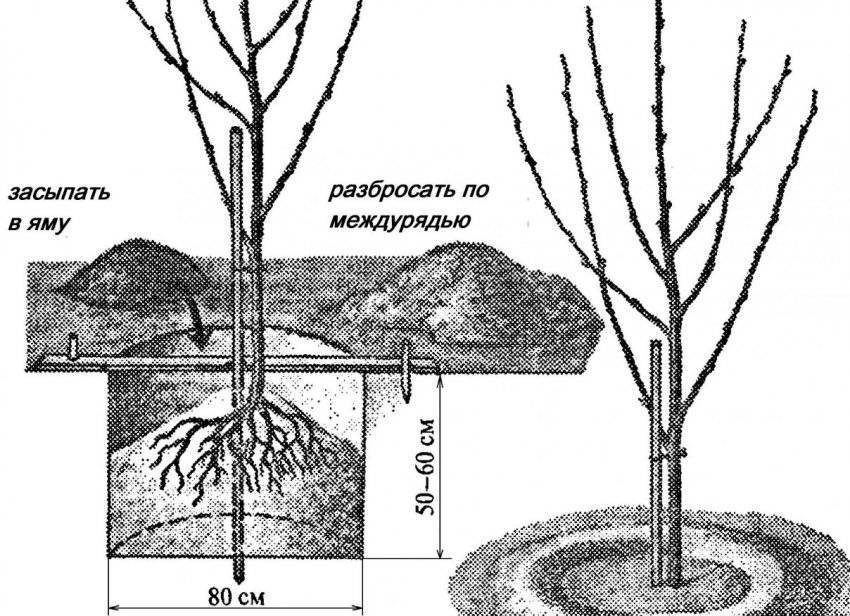 Если почва на участке тяжелая, ее следует структурировать с помощью песка или торфа. Углубление поливают проточной водой и оставляют на 2 недели. Спустя 14 дней производят посадку саженцев, тщательно расправляя корни. Они должны свободно находиться в лунке.
