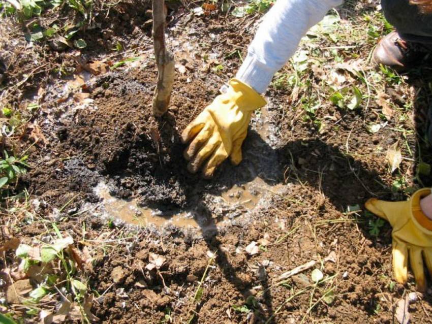 Верхние 30 см почвы смешивают с 20 кг компоста и 30 г суперфосфата. Этой смесью заполняют яму на 1/3, устанавливают поддерживающий кол и заливают 20 л воды.