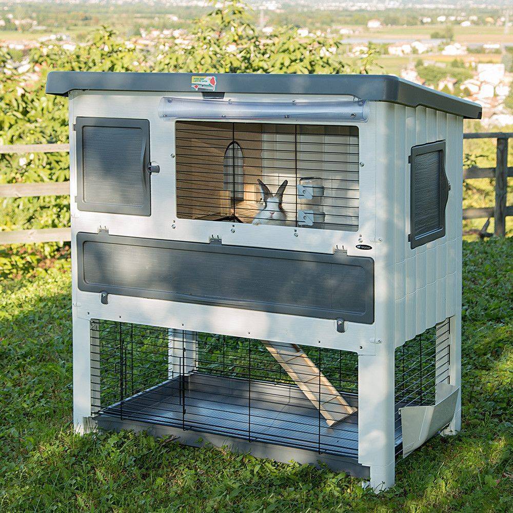 - Домик, состоящий из трёх ярусов, в котором смогут с комфортом разместиться 6 кроликов. Верхние ярусы можно слегка отодвинуть, чтобы предотвратить попадание фекалий на этажи ниже. Кроме того, задние стенки второго и третьего ярусов выполняются под наклоном, так что фекалии могут скатываться, не накапливаясь на ярусе.
