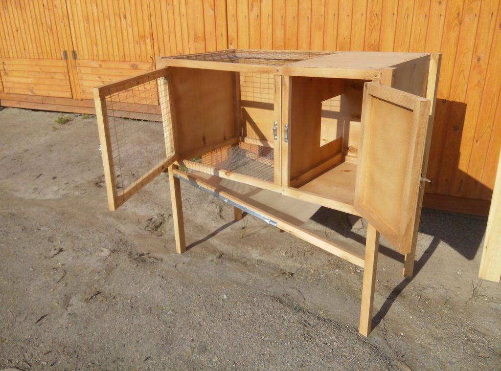 Двухсекционная клетка представляет собой деревянный короб длиной 1,4 – 2 м, высотой от 0,5 до 0,7 м и шириной 0,5-0,7 м. Верхняя, нижняя, боковые и задняя стенка делаются сплошными. Лучше всего использовать для этого сбитые без щелей конструкции из ошкуренных некрашеных досок, но возможны и другие решения, например, из мелкоячеистой сетки или из жести. В двух последних случаях стоит позаботиться о жестком, крепком каркасе, который будет держать на себе всю конструкцию.