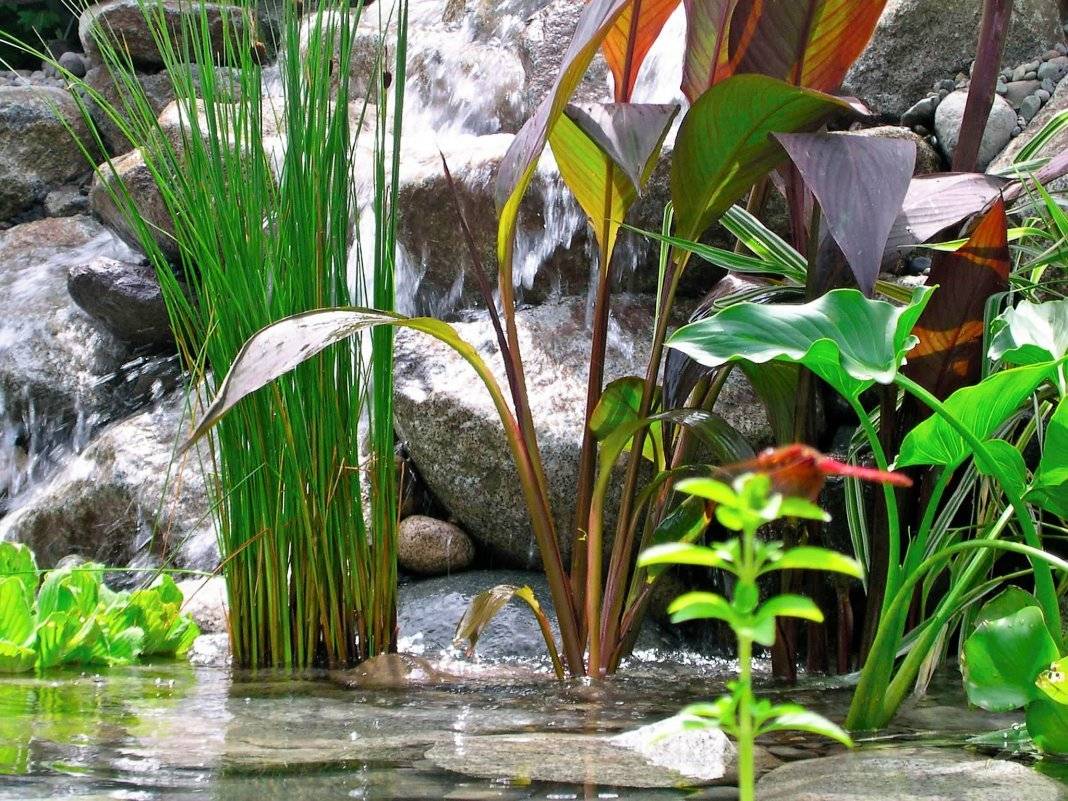 Растения, живущие в воде сажайте в контейнерах, чтобы они не разрослись по всему водоёму. Если же водоём небольшой и во время зимы промерзает до самого дна, то стоит вынимать контейнеры с растениями для хранения до весны. Не рекомендуется сажать рогоз или тростник, эти виды легко могут вытеснить все остальные и широко разрастись по всему периметру водоёма.
