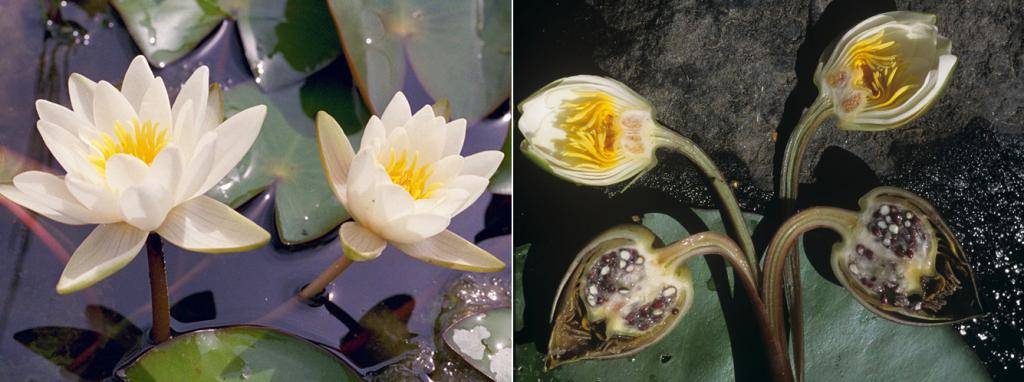 Белая кувшинка, которая часто встречается в естественных водоемах, имеет мощные корни до 5 см толщиной, на поверхности располагаются черешки и цветоносы, которые начинают цветение с мая и продолжают его до заморозков. Листья округлые и широкие до 25 см, цветы — белоснежные, каждый держится 4 дня, после чего завязывается плод под водой. После созревания семена из коробочек высыпаются и постепенно опускаются на дно, где затем прорастают.