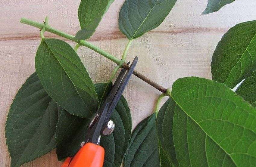 Побеги гортензии разделяют на части с 2-3 парами почек. Нижний срез должен быть косым, чтобы впитывалось больше воды, верхний – ровным. При этом от междоузлий отступают примерно на 2 см.