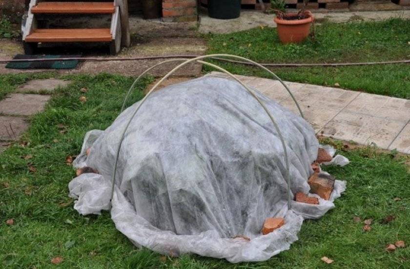 На зиму их тоже надо хорошенько укрыть. Засыпаем саженцы опавшими листьями, затем устанавливаем над ними невысокий каркас и накрываем его укрывным материалом.