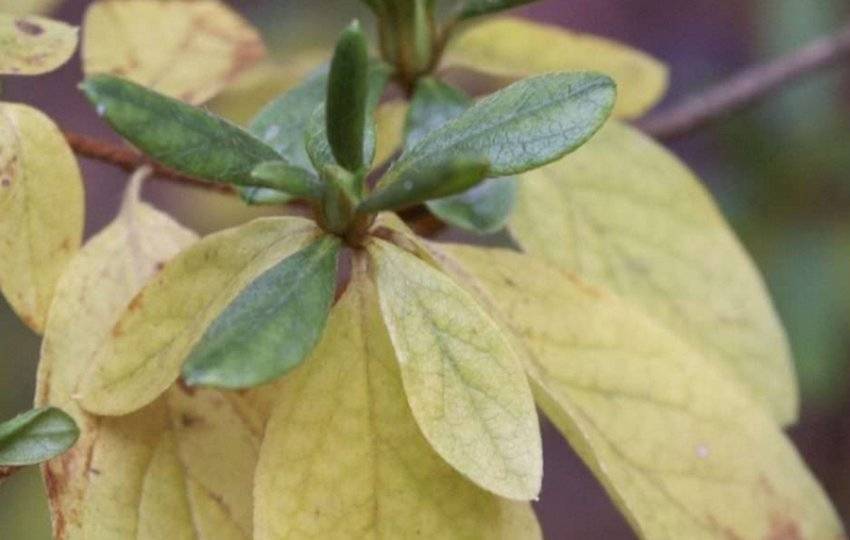 Пожелтевшая листва указывает на заражение хлорозом. В этом случае необходимо подкисление почвы коллоидной серой в порошке. Достаточно рассыпать 2-3 ст. л. на влажную землю под кустом. Затем рекомендуют поместить мульчу из перепревшей хвои.