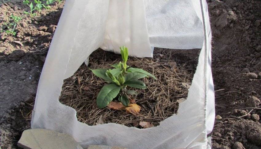 В открытый грунт ростки можно высаживать, когда они имеют слегка одревесневший стволик, не менее 7–8 настоящих листьев и хорошо заметную почку на верхушке. В ноябре, чтобы порывы сильного ветра не повреждали листья, юные рододендроны должны быть укрыты материалом, пропускающим воздух.