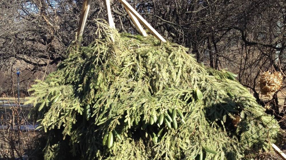 Ветки растения пригибают к земле, а сверху кладут ельник. Сооружение должно пропускать воздух. Укрытие хвойными ветками подходит для защиты невысоких кустарников. Крупные растения зимуют под конструкцией из плотных нетканых материалов.